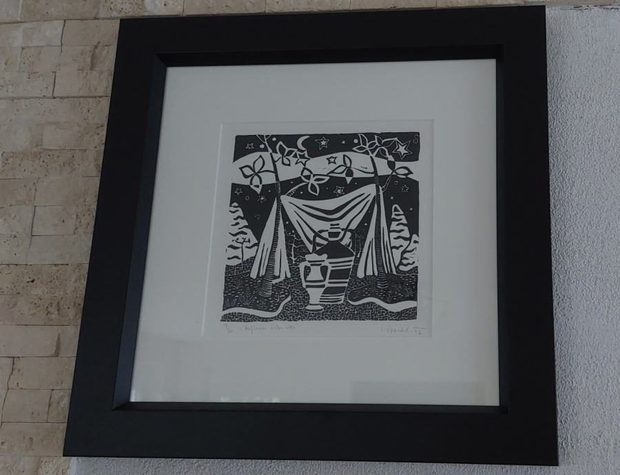 Mere odtisa 20x20 cm, mere okvirja zunaj 43x43 cm.