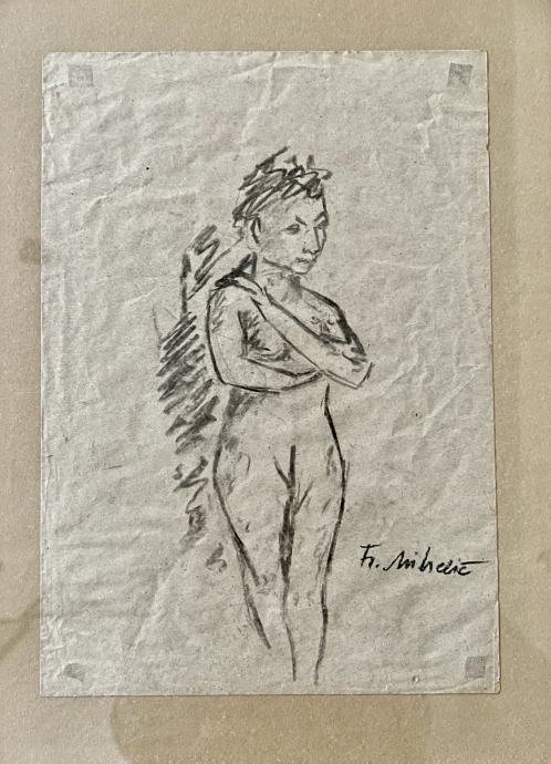 Risba Franceta Miheliča, okvirjena, akt, podpis