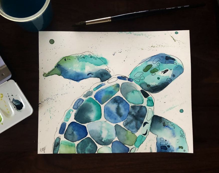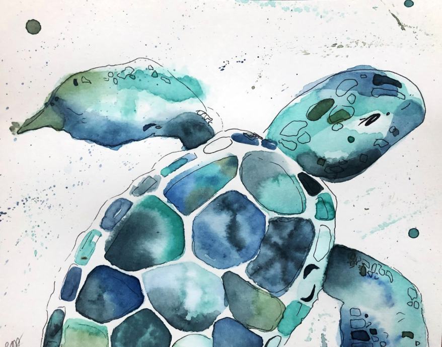 Akvarel morske želve v dimenzijah 25,2 x 22,4 cm. Slika naslikana z namenom ozaveščanja onesnaženosti oceanov ter njihovi krhkosti in pomembnosti.