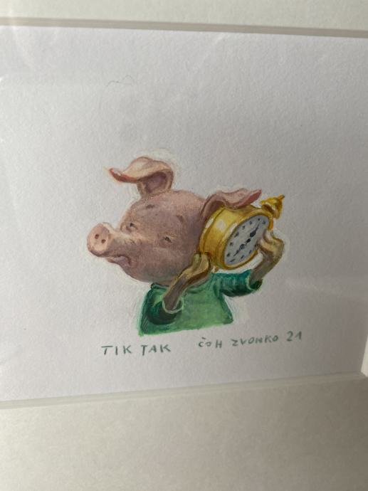 Prodam originalno, podpisano ilustracijo "Tik tak" uveljavljenega akademskega slikarja Zvonka Čoha. Original s paspartujem in lesenim okvirjem.