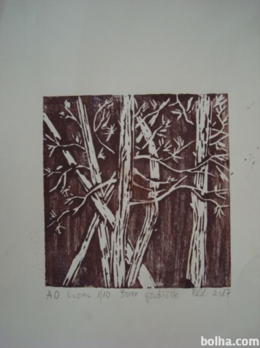 Prodam originalni avtorski linorez "Borov gozdiček v Istri". Brez okvirja, 25 x 25 cm.
