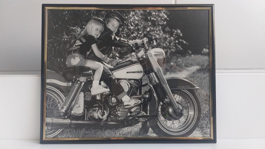 Slika v zastekljenem okvirju z otroškim motorističnim motivom