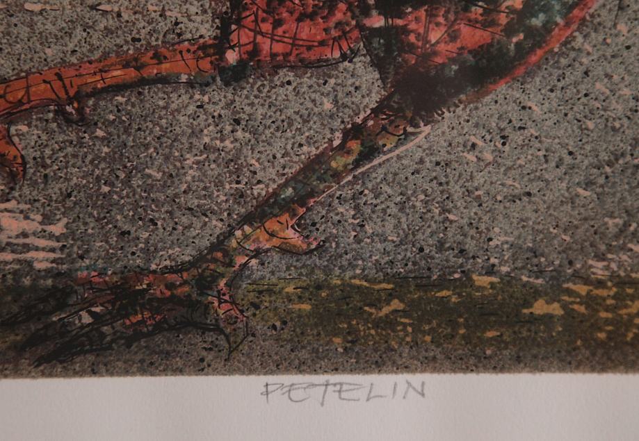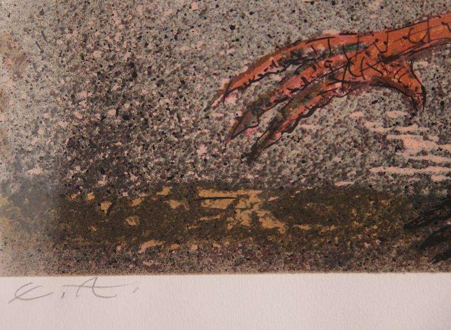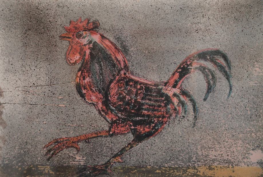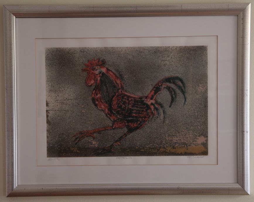Opis izdelkaGrafika s prizorom Petelina izpod rok akademskega gledališkega in likovnega umetnika Franceta Slane, upodablja živahnega petelina kot simbol jutranje energije in prehoda svetlobe. Motiv je dovršeno izveden z jasno plastiko linije in barvno dinamiko, ki ohranja izrazno živost, hkrati pa odraža umetnikov slog – igriva figurativna naracija z močno vizualno prisotnostjo.