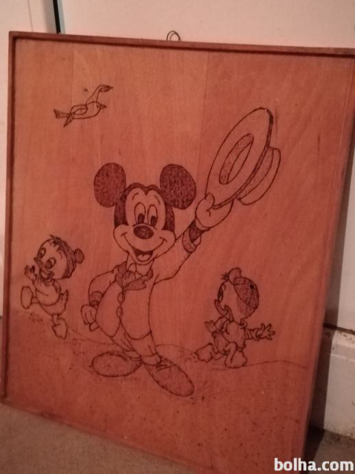 prodaja se starejša žgana slika na les miki miška racman,pirografija na les,ca 33x39 cm, - 14,99 evr,