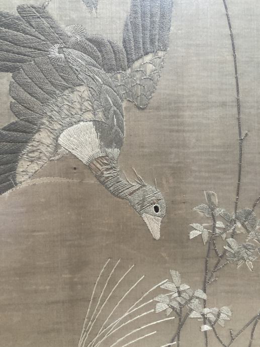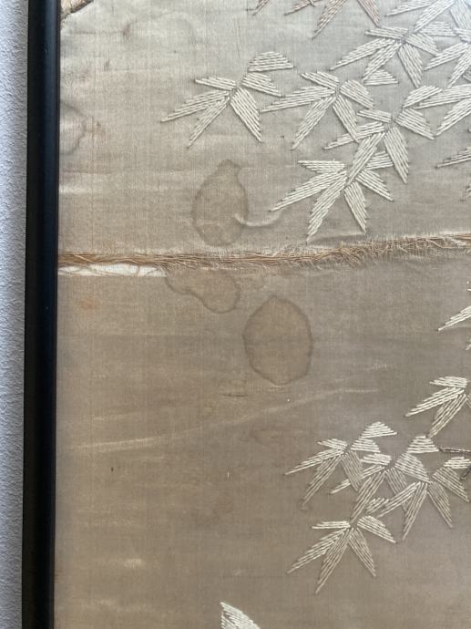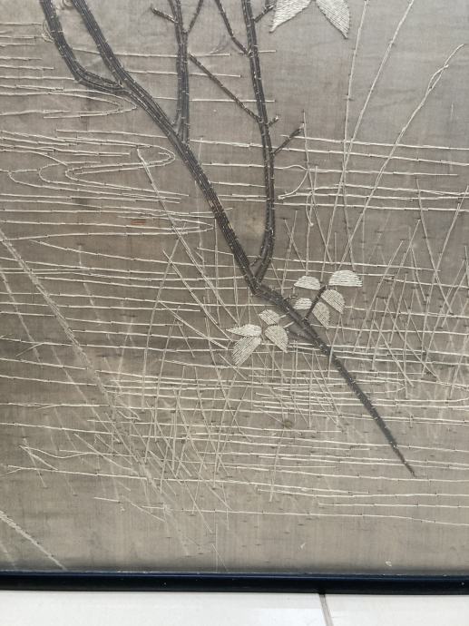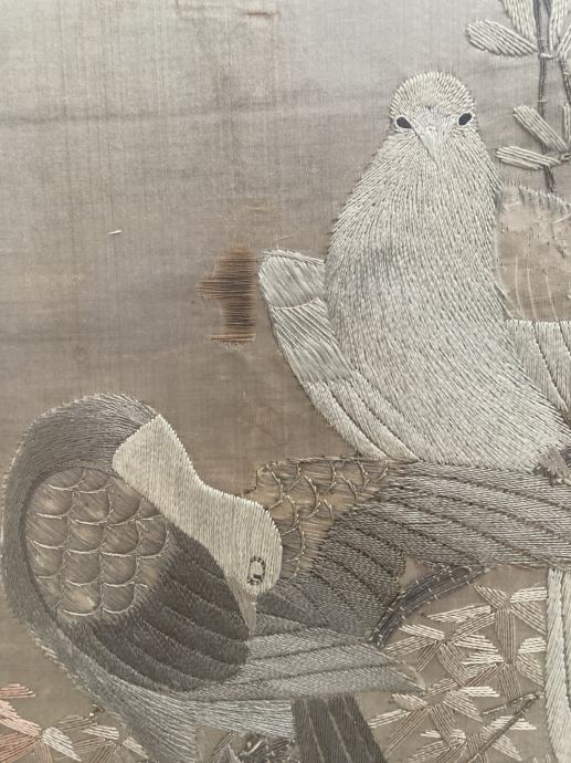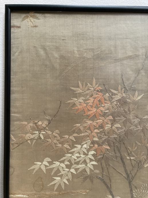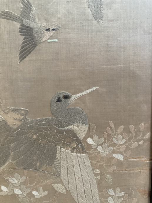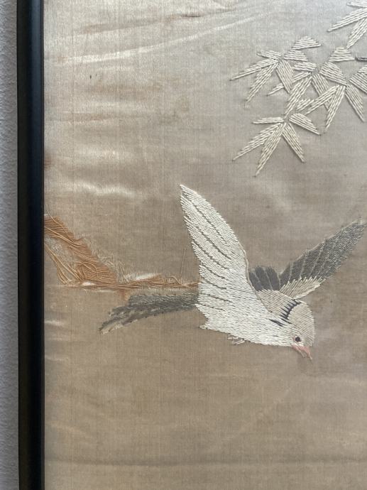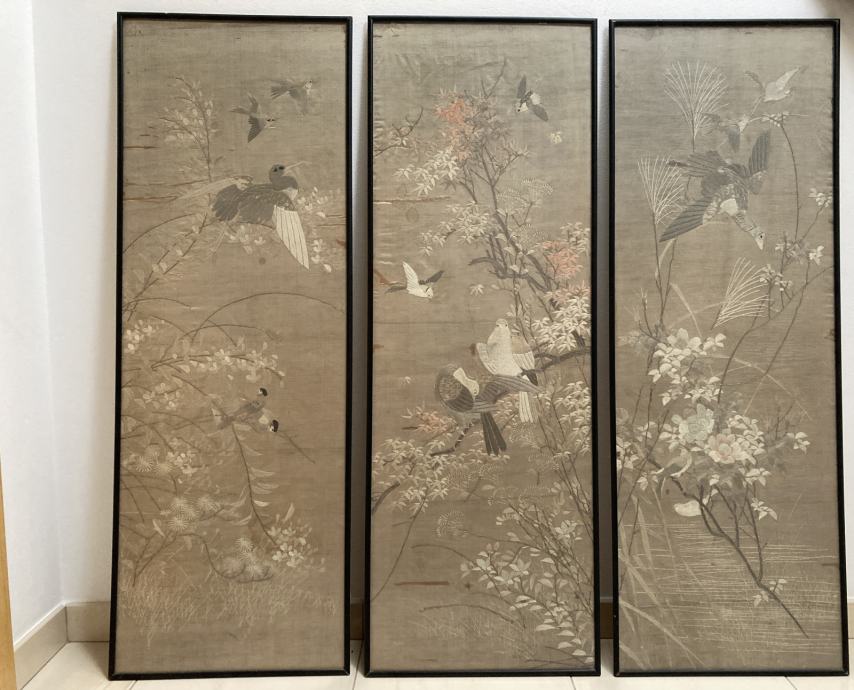 Tri uokvirjene azijske vezenine iz svile. Zelo staro.