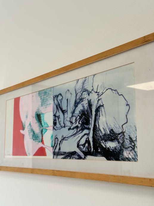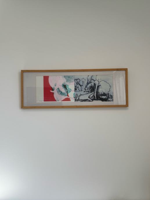 Prodam abstraktno sliko, Mešana tehnika, zelo moderna, podpisana Miha - 2009, Okvirjena in zastekljena. 2/5. Mere: 26x66cm.