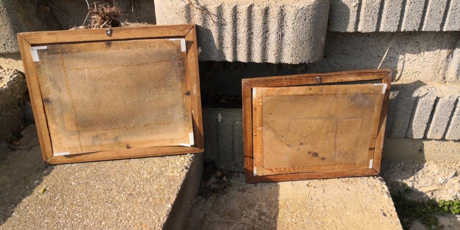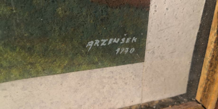Prodaja se stara slika ARZENŠEK,stara hiša 1970, stara cerkev in obzidje, 1970, stanje na slikah,uokvirjena sliki, ca 45x38cm,
