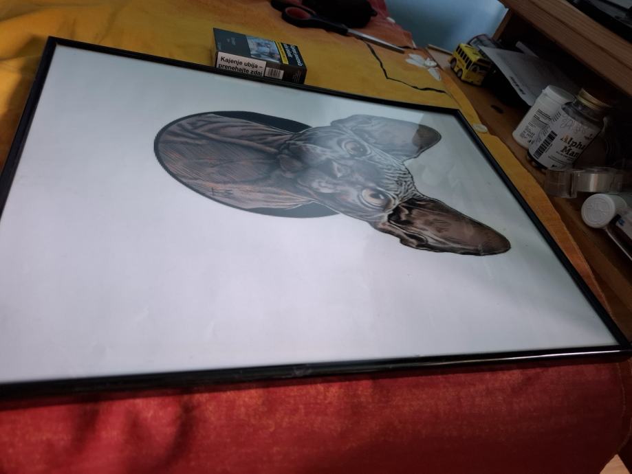 Slika,dolžina 41cm , širina 31cm,sliko kupil 40€, vse drugo dal mojstru ,ki dela na Partizanski v Mariboru od prešanja slike,ki je bila v tulcu,prešanje, ravnanje traja tam 2dni,les mi je dal srednje poceni,steklo tudi in ozadje pa najbolj enostavno.Delo sploh ni tako poceni,kot sem mislil.Plačal sem 55€ + 40 slika. Prodam pa za 110€,Rok iz MB.