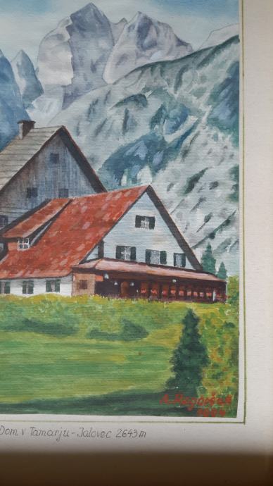 Prodam sliko doma v Tamarju z Jalovcem v ozadju. Akvarel/gvaš, Regoršek, 1994.