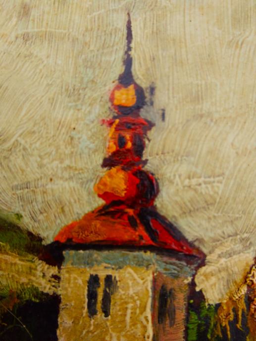Prodam staro sliko v tehniki olje na lesonit neznanega avtorja, brez podpisa, motiv Bohinj - cerkvica sv. Janeza Krstnika.