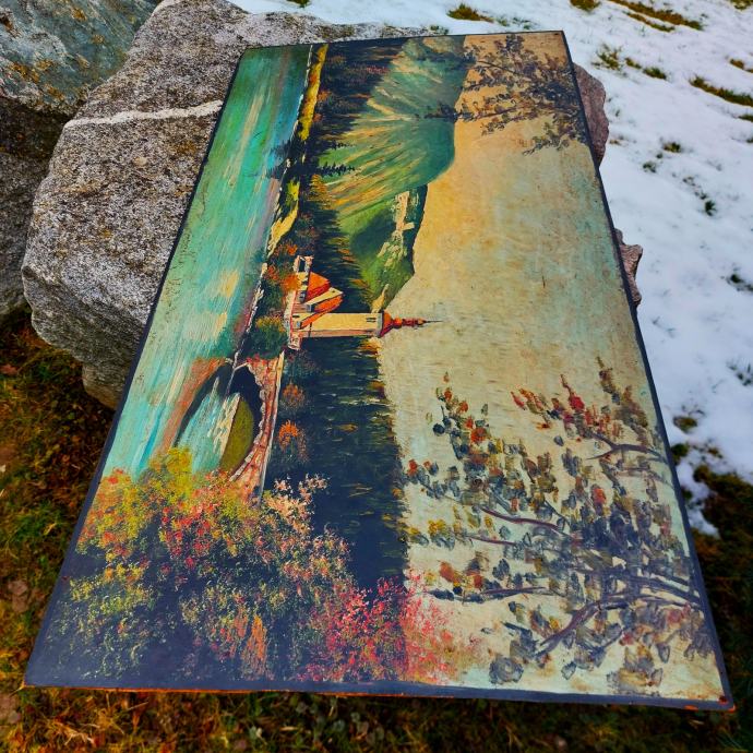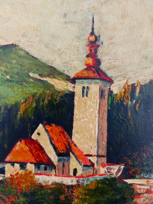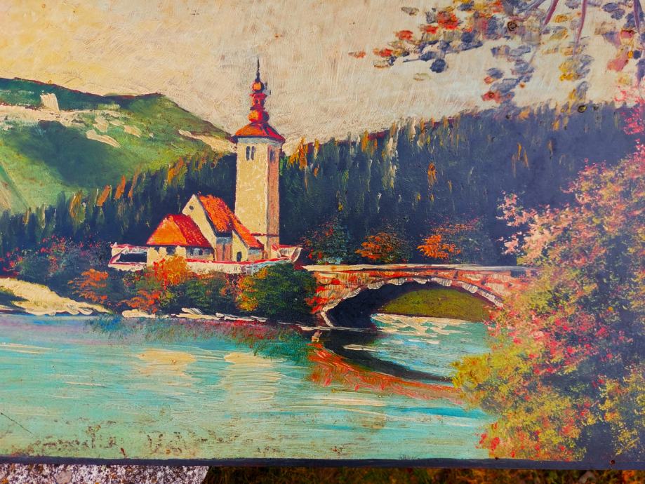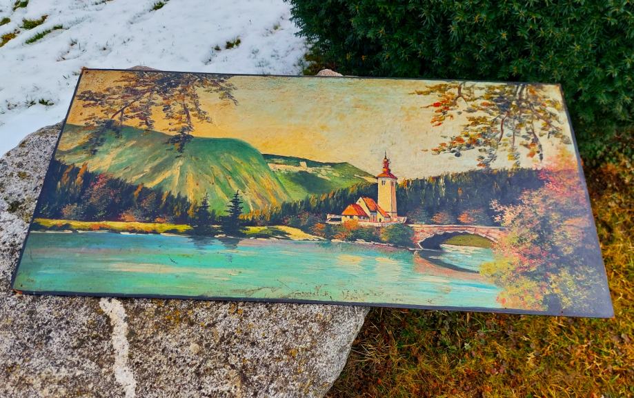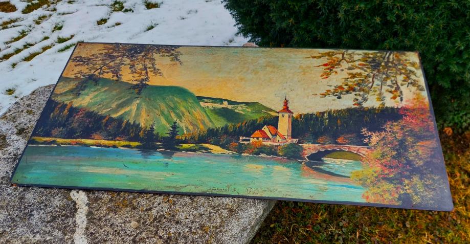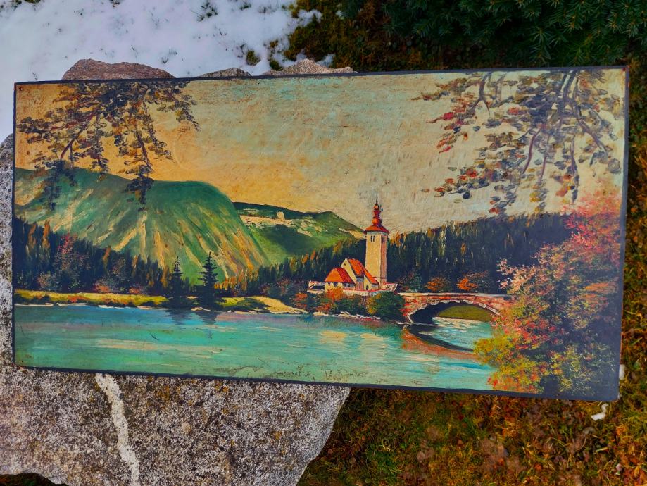 Stara slika olje na lesonit motiv Bohinj cerkvica sv. Janeza Krstnika