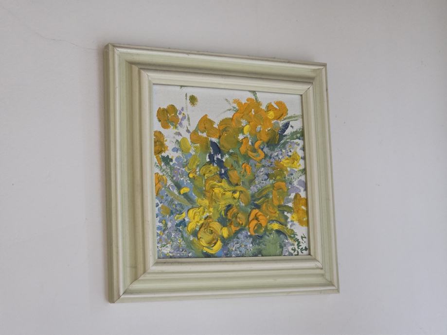 Prodam izvirno sliko olje na platnu z motivom rumenih cvetov v svetlem lesenem okvirju.