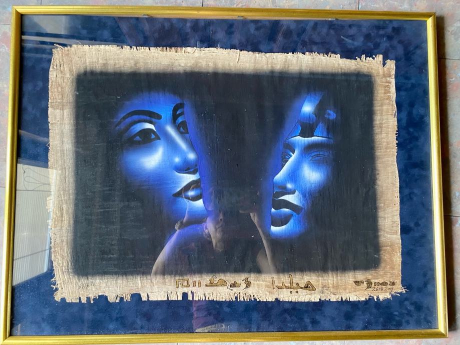 Slika z motivom mask na papirusu. Prodamo z okvirjem. Dimenzije z okvirjem 77x59 cm.