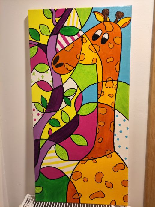 Živobarvna slika na platnu žirafa v velikosti 80x40cm. Ročno delo v izvedbi babaloo art. Odlično poživi prostor, zato še posebej primerna za otroške sobe ali ostale prostore.