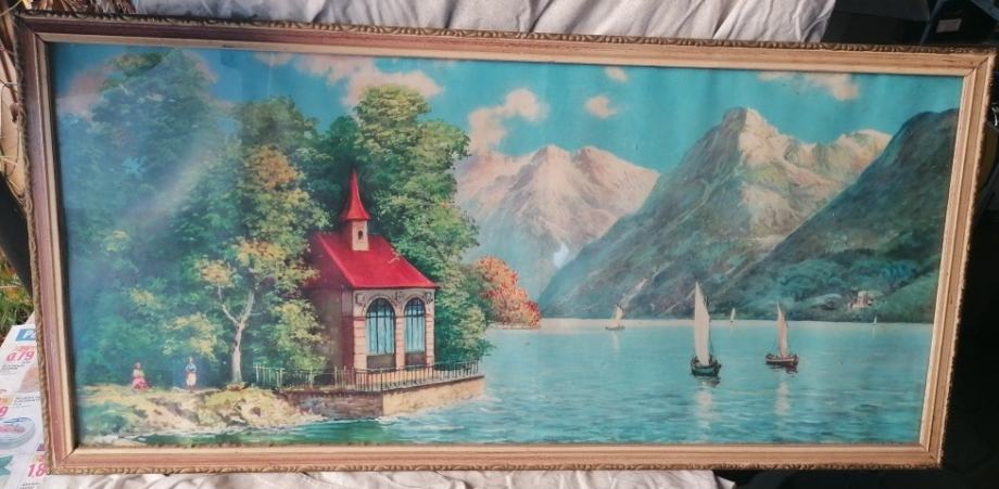Na voljo je SLIKA v lepem okvirju s steklom 81 x 39 cm KAPELA OB JEZERU.