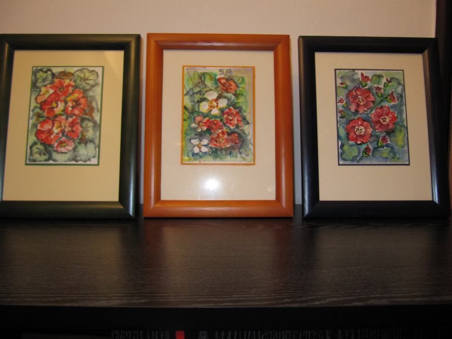 Enaki formati slik, okvirji v oranžni, modri in zeleni barvi, dimenzij 22 x 28 cm, original akvareli, prodam posamezno ali skupaj. Cena je za eno sliko. Vse tri skupaj pa samo 90,00 €! Slike se lahko obesijo ali postavijo. Ne pošiljam po pošti!