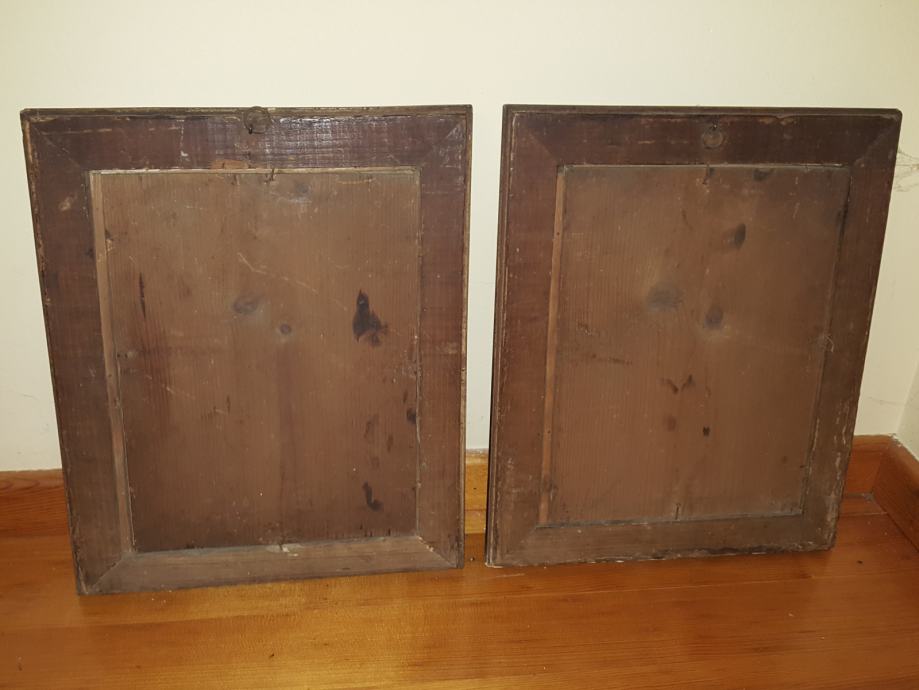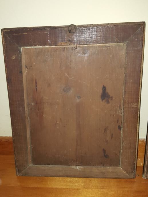 Sliki sta v lesenih originalnih pozlačenih okvirjih z veliko patine in sta zastekljeni.