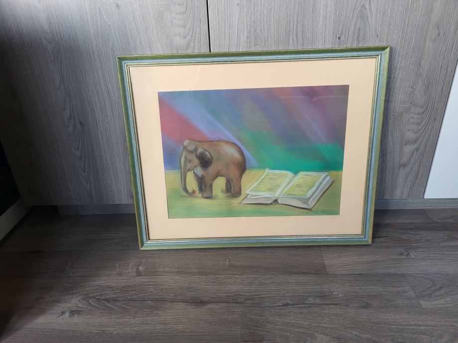 Prodam sliko s simpatičnim motivom slončka in odprte knjige.