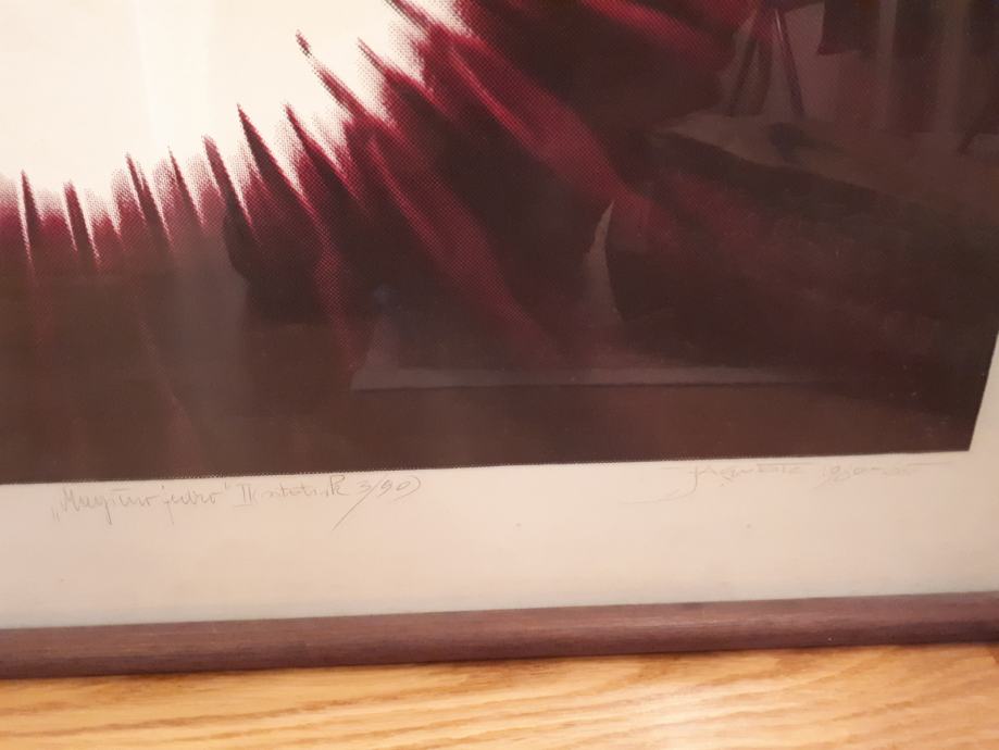 Stane Jagodič, Magično jedro II, sitotisk, 3/90, 65 x 62 cm, 1980-85, sign. desno spodaj. (vijolični toni, slabo vidno zaradi fotografiranja - steklo), 90 € prodam (041-878-310)