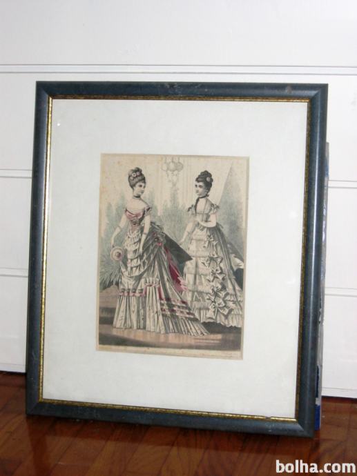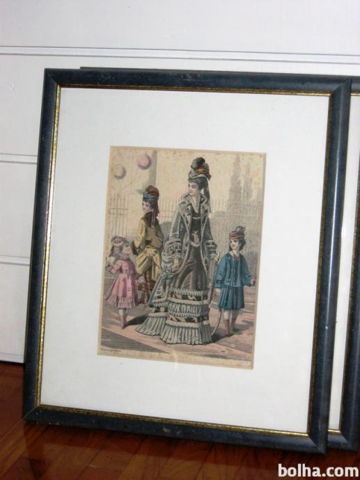 Slike modnih listov v okvirju, ročno kolorirane. Na novo uokvitjene. Zelo dekorativne. Iz začetka prejšnjega stoletja. Na voljo 2 sliki.