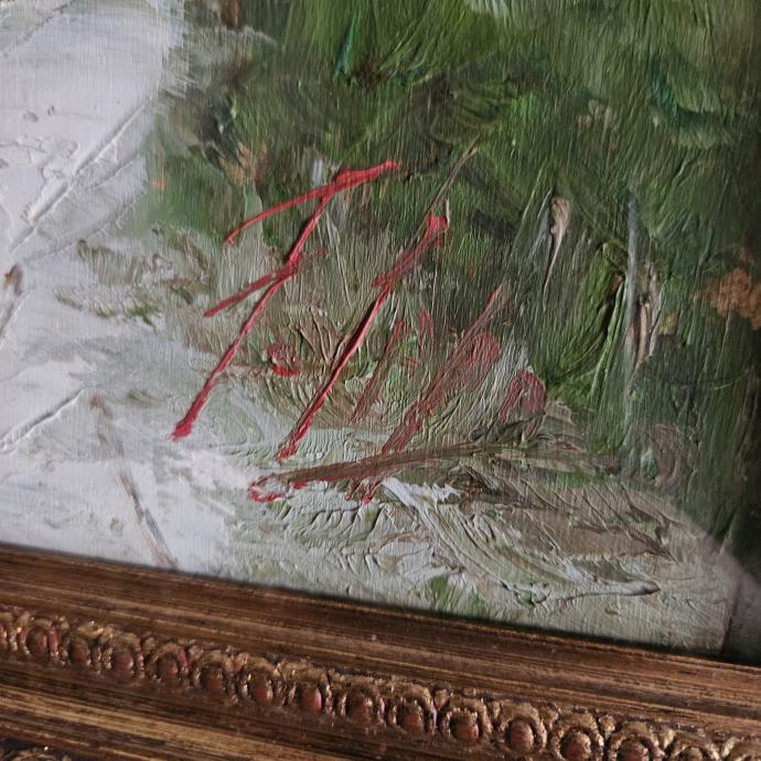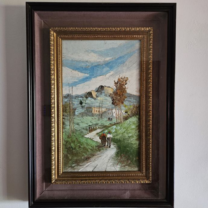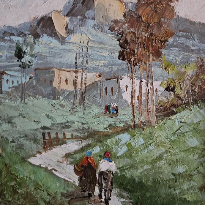 Čudovita oljna slika, ki prikazuje idilično pokrajino z zelenimi polji, gorami in potniki na poti, pod dramatičnim nebom. Delo je podpisano, a zaradi neberljivosti avtor ostaja neznan.