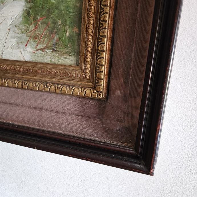 Umetnina je vstavljena v masiven dvojen ročno izdelan lesen okvir.