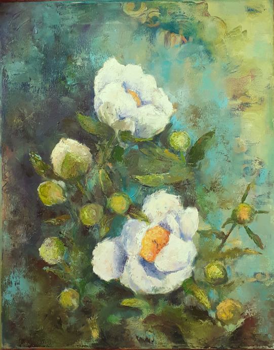 Umetniška slika "Cvetje/Potonike bele", original, olje na napetem platnu, velikost 50*40cm, neuokvirjena.