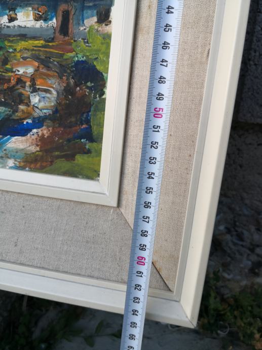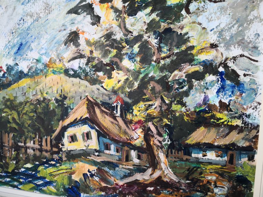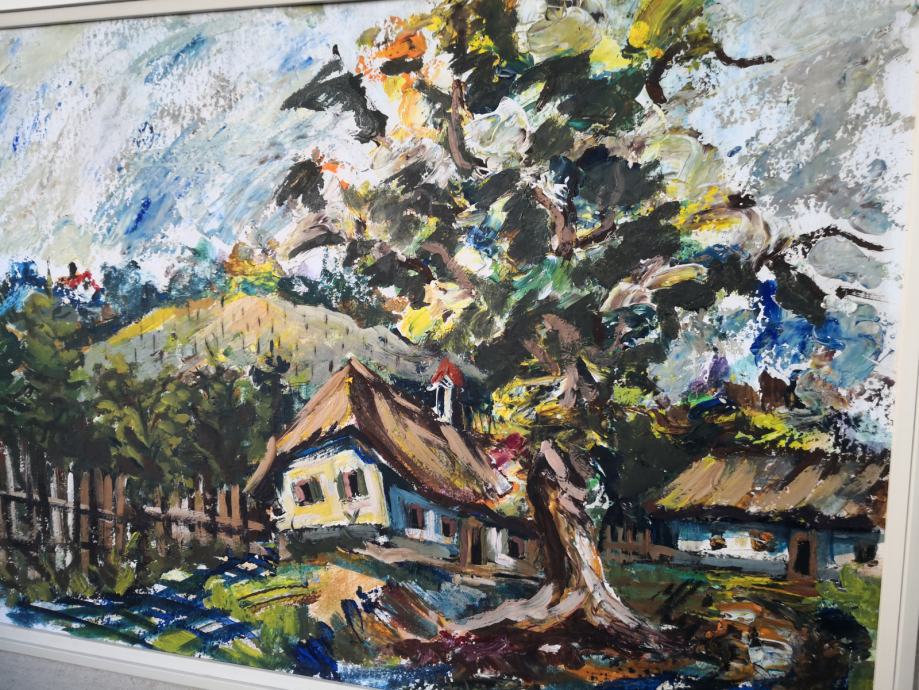 Prodaja se umetniška slika olje na šperplato, olje, podpisana slika, trenutno še nedešifriran slikar, zato taka cena, kmečka hiša, vinograd,,,,, mere slike z okvirjem ca 87x65cm,