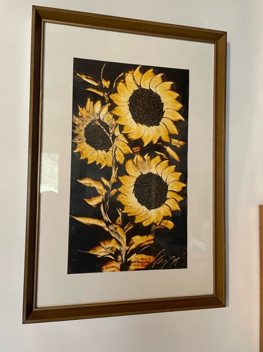 Prodam umetniško sliko s motivom treh sončnic, podpisano s strani avtorja(kdo je nevem). Sliko odlikujejo tople rumeno-oranžne barve na temnem ozadju, ki dajejo močan kontrast in eleganten vtis.