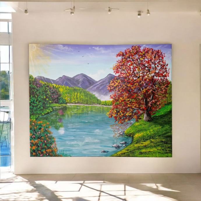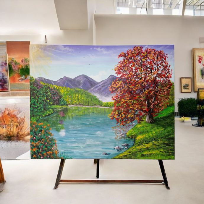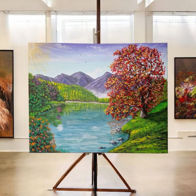 Unikatna akrilna slika – Jesensko drevo ob jezeru (ročno delo, 50×40 c