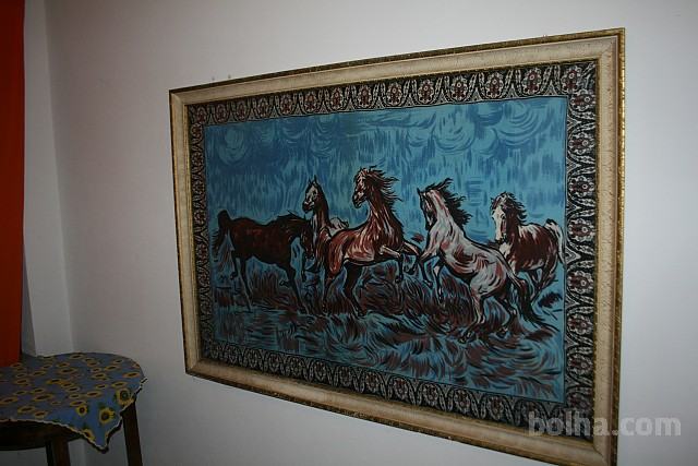 Velika slika Konji 155 X 105 cm , poslikava na platnu Po pripovedovanju na bi bila slika iz Iraka prodam iz lastne zbirke .Mozna menjava za drugo starino, umetnino ali Hi- fi . Lahko pripeljem do Ljubljane Sem v Postojni 041 551153