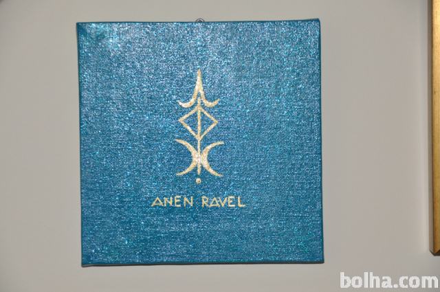 Na turkizni svetleči podlagi z zlato barvo naslikan vilinski simbol: ČAROVNIKOV NASVET (anen ravel), 15x15