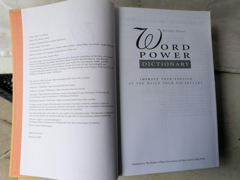Na voljo je odlično ohranjeni (nov) slovar WORD POWER DICTIONARY : IMPROVE YOUR ENGLISH AS YOU BUILD YOUR VOCABULARY, Reader`s Digest, 1998, reprinted 2005, 1088 strani, 29 cm..