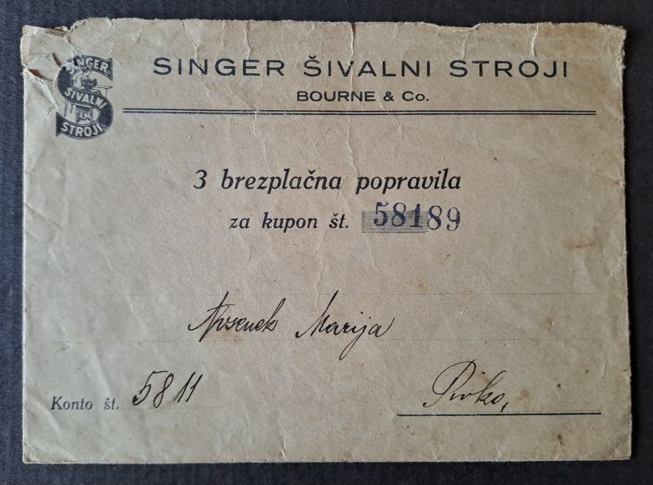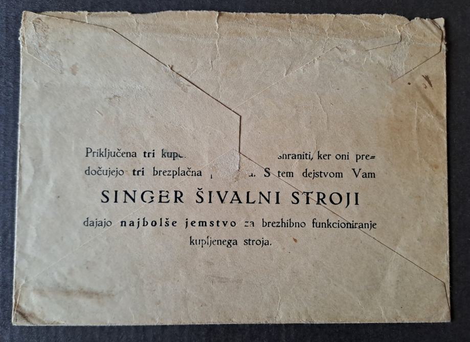 Prodajam dvojnike in ostale viške iz svoje zbirke. Kuverta Singer šivalni stroji, kupon za brezplačna popravila.