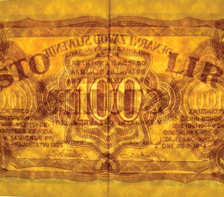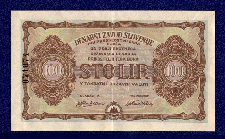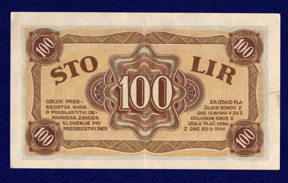 Bankovec STO LIR, izdelano leta 1944. Za PARTIZANSKI denar je vodstvo OF Slovenije konec februarja ali prve dni marca 1944 zbralo skupino arhitektov in slikarjev, ki naj bi pripravili osnutke za partizanska zakonita plačilna sredstva, veljavna na osvobojenem ozemlju. Denarni zavod Slovenije je kot edina samostojna emisijska banka v takratni okupirani Evropi na majhnem delu osvobojene Slovenije opravil uspešno nalogo pri emisiji plačilnih bonov med NOB.