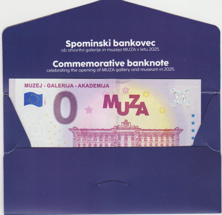 Prodam POSEBNA IZDAJA SPOMINSKI BANKOVEC 0 EURO (0 EVRO) -MUZA-MUZEJ,GALERIJA,AKADEMIJA v darilni kuverti (SLOVENIJA) 2025.UNC kvalitete. IZDALA EVROPSKA BANKA -VODNI TISK, ZAŠČITNI TRAK... Pošljem po pošti z navadnim pismom(1,30€), ali priporočeno(3,10€). Kupec plača stroške dostave. Možnost plačila na osebni račun, ali po dogovoru. 041 754 917