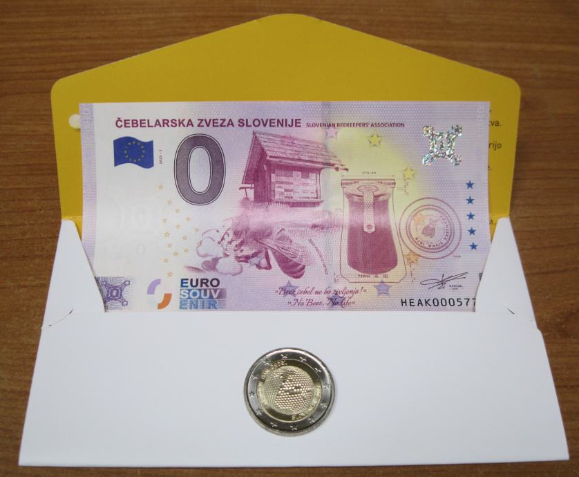 Spominski bankovec "Brez čebel ne bo življenja" za 0€ in kovanec 2€ izdan ob svetovnem dnevu čebel leta 2018 v kompletu.