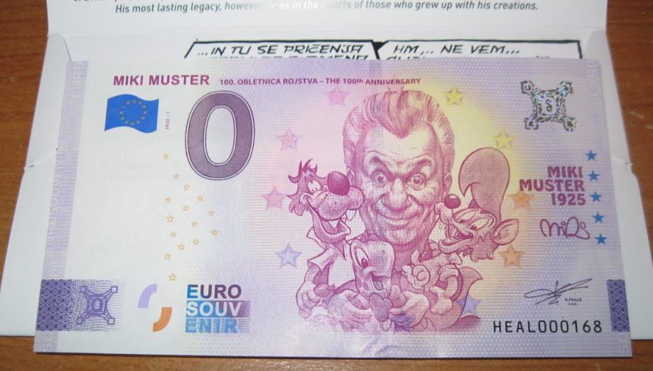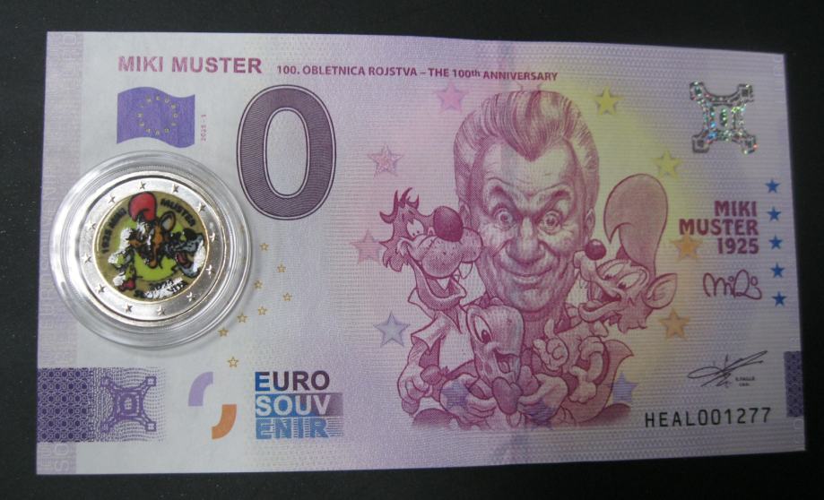 Miki Muster spominski bankovec za 0€ in barvni kovanec 2€ v kompletu.