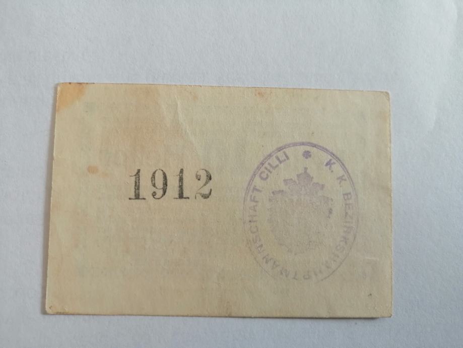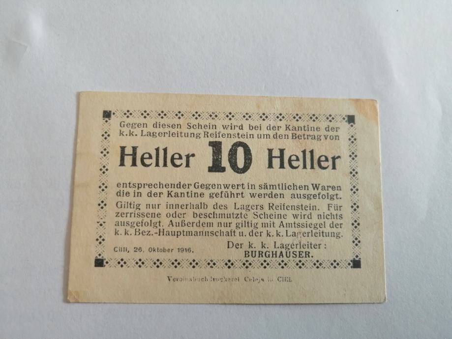Naprodaj bankovec za 10 hellerjev ki so ga uporabljali v lokalni kantini v taborišču Reifenstein Celje. Bankovec je zelo lepo ohranjen, raven, nekaj pack na njem. Prevzem v Celju ali po predhodnem nakazilu pošljem po pošti. Poštnina je 2,5 evra priporočeno.