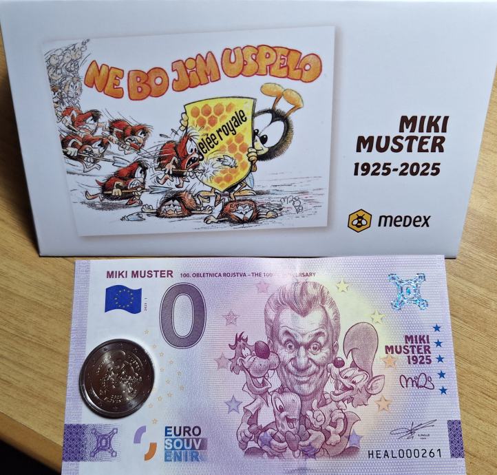 MIKI MUSTER, SPOMINSKI KOVANEC 2€ UNC IN SPOMINSKI BANKOVEC 0€ V DARILNI OVOJNICI