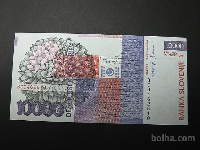 Perfektno ohranjen bankovec za 10.000 tolarjev v polni UNC kvaliteti.