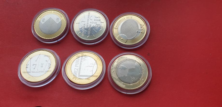 Prodam 6 spominskih 3€ kovancev v kapsulah. So unc in v kapsulah. Cena za vse je 26€. Možen nakup posameznega kovanca-cena 4,50€.