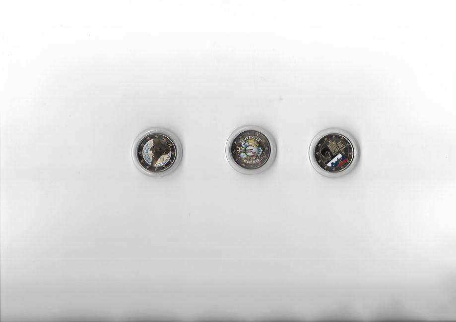 Prodam 3 različne barvaste 2 € slovenske kovance. Napisana cena velja za enega, za vse tri je cena 35 € + poštnina,