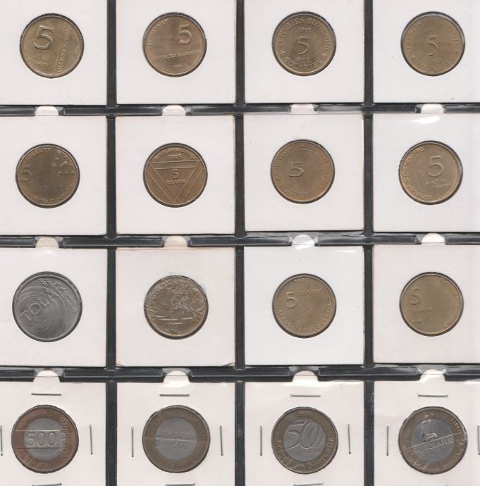 Prodam set slovenskih jubilejnih Tolarskih kovancev, kateri je viden na priloženih slikah. Set zajema 16 kovance, pri katerem manjka eden 500 Tolarski kovanec. Cena je za cel set skupaj.
