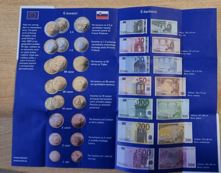 Prodam Slovenski €_začetni komplet in zloženko s predstavitvijo slovenskih €.