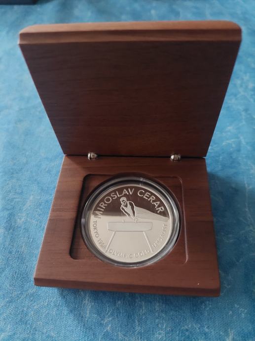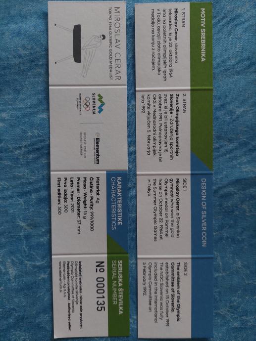 Prodam srebrnik Miroslav Cerar, čistine 999/1000, nov, nikoli odpirana embalaža, pakiran v kartonski embalaži ali pa v darilni hrastovi škatlici, srebrniku je priložen original oštevilčen certifikat. Srebrnik je bil izdan v zelo omejeni seriji/nakladi in sicer samo 300 kos. Srebrnika v prosti prodaji ni mogoče več kupiti, ker je razprodan. Srebrnik je bil izdan ob obletnici osvojitve zlate olimpijske medalje, ki jo je Miroslav Cerar osvojil v Tokiu, 22. oktobra 1964, na konju z ročaji. Ta srebrnik je posebno, enkratno oz. primerno darilo za rojstni dan ali za kakšne druge priložnosti, lahko pa je tudi kot nepričakovano presenečenje nekomu, ki praznuje ali pa kot spomin za večletno udejstvovanje v športu. Cena za srebrnik v orehovi škatlici je 65 eur. Strošek pošiljanja srebrnika po pošti je 3 eur.