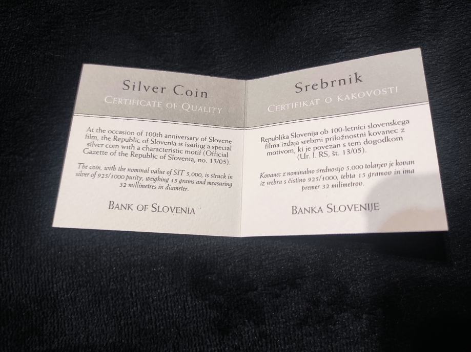 Srebrnik ob 100 letnici slovenskega filma z certifikatom v original embalaži cena 60€