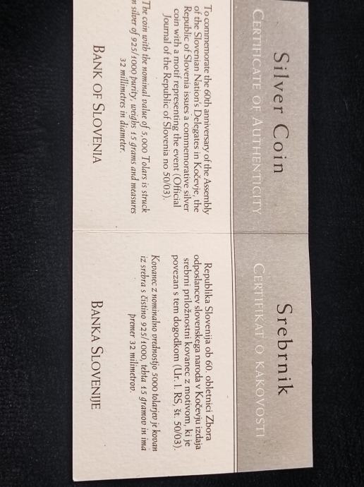 Srebrnik 60 let zbora odposlancev z certifikatom v original embalaži cena 60€