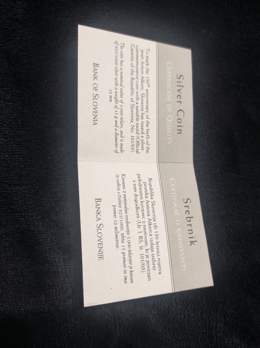Srebrnik Anton Aškerc z certifikatom v original embalaži cena 50€