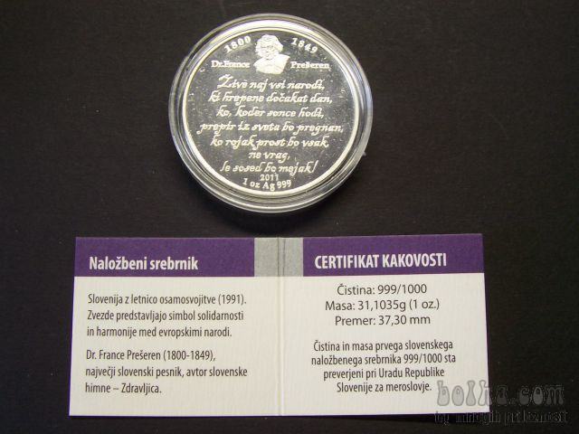 SREBRNIK SLOVENIJE - PREŠEREN - 1 OZ - 2011 Z CERTIFIKATOM